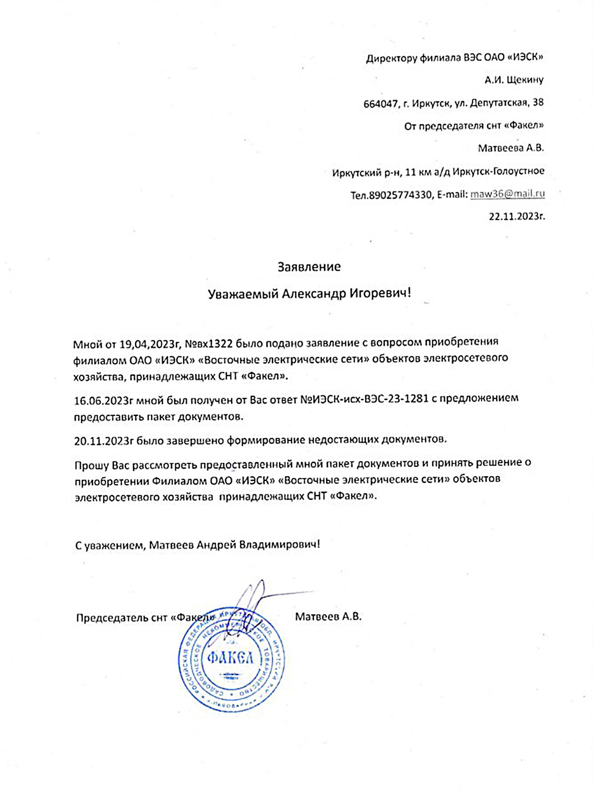 P.S. Документа об оценке сетей Матвеев в общем чате садоводам так и не показал.